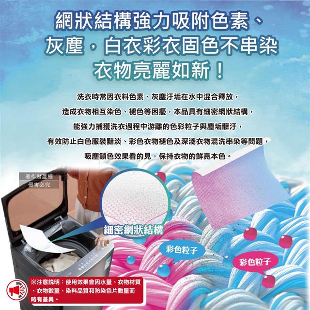 ●細密網狀結構強效吸色除塵,固色護衣不串染,保持衣物亮麗如新!