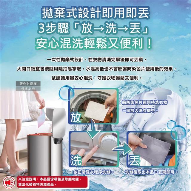 ※根據衣物數量多寡及衣物深淺,可適量增加防染色片用量。