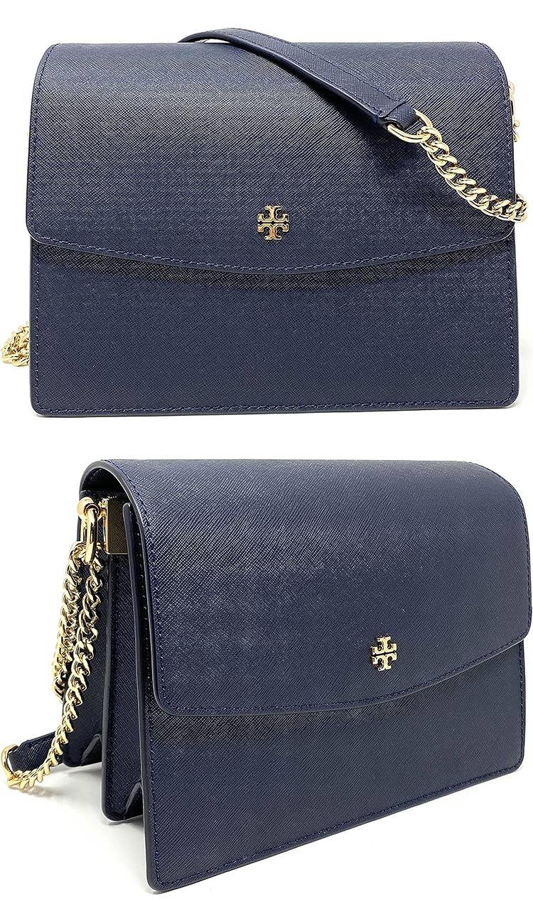 TORY BURCH 雙T-LOGO防刮皮革翻蓋斜背包-深藍