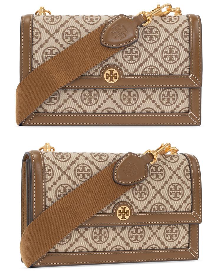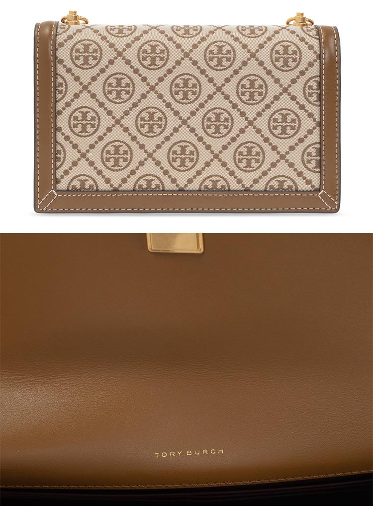 TORY BURCH 滿版LOGO提花拼接皮革斜背包-卡其駝