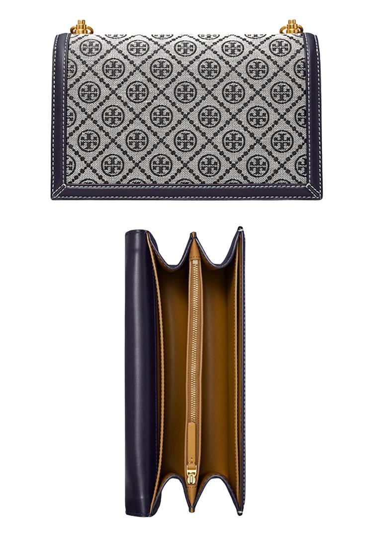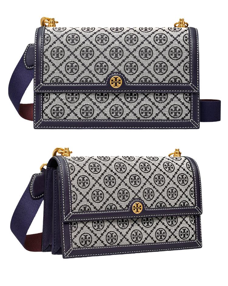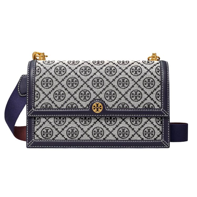 TORY BURCH 緹花拼接皮革斜背包-深藍