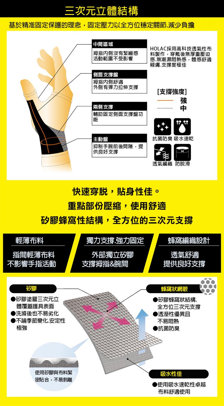 ●三次元立體結構強力固定,專業部份針對支撐穩固手骨設計,加強拇指與指間韌性