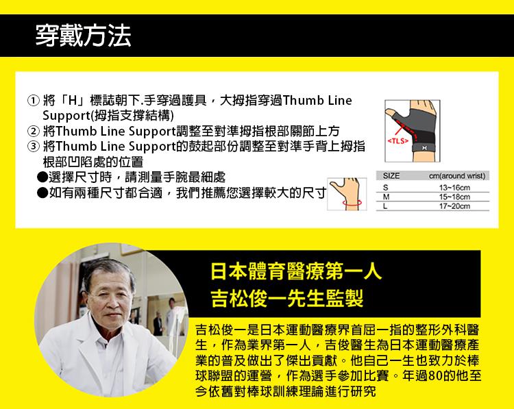 1.將「H」標誌朝下,將手穿過護具,大拇指穿過Thumb Line Support(拇指支撐結構)