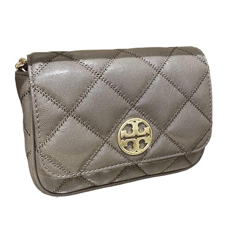 TORY BURCH 翻蓋菱格紋皮革斜背包-岩灰