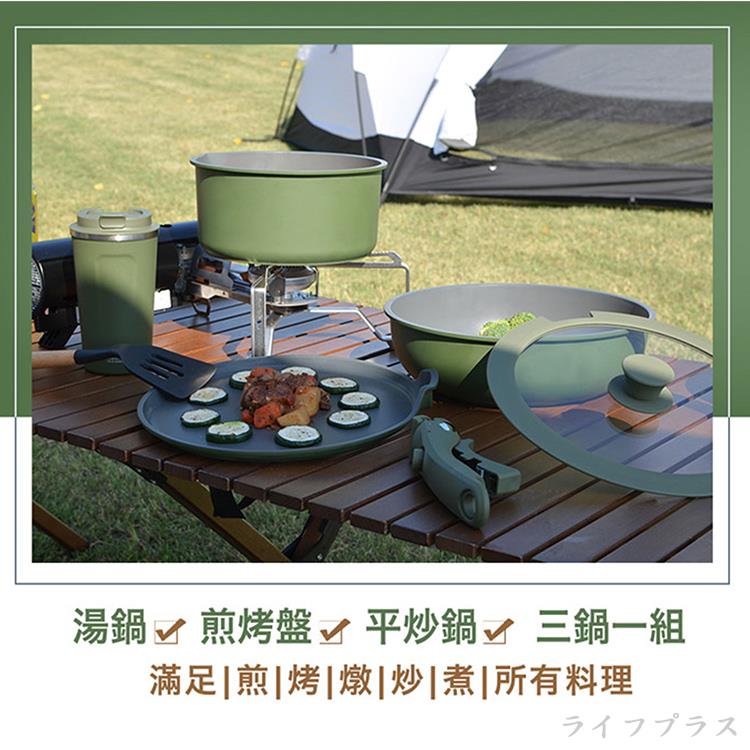 煎、炒、燉、煮、烤三鍋一組,滿足露營料理需求 矽膠握柄可拆卸式設計