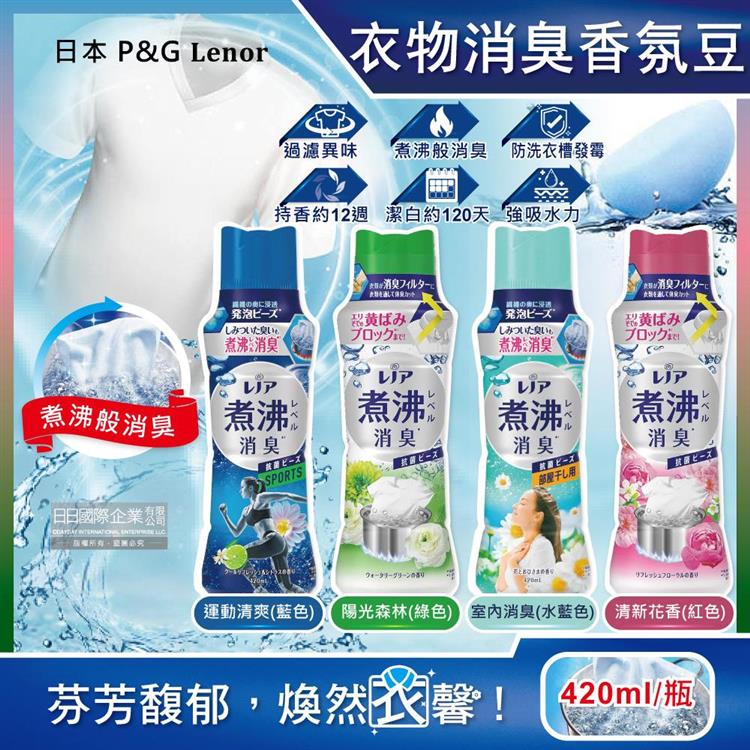 日本P&G Lenor蘭諾-煮沸般超消臭汗味衣物除臭芳香顆粒香香豆420ml/瓶(香氛柔軟精/洗衣槽防霉/室內晾曬防臭劑/滾筒直立洗衣機適用)