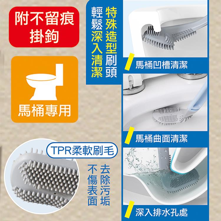 特殊造型設計,刷頭TPR柔軟刷毛材質,輕鬆刷洗清洗不留痕,好拿好刷,廁所馬桶、瓷器牆面,無論大面積或小角落、間隙,均能刷洗乾淨,附無痕貼掛勾收納方便,好拿好刷,廁所清潔好幫手。