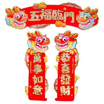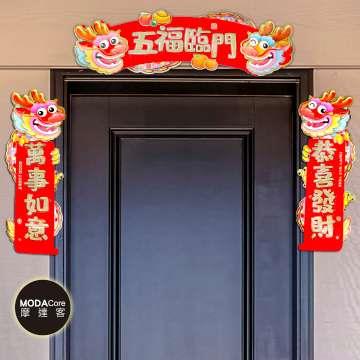 摩達客◉春節開運招財◉龍年五福臨門恭喜發財萬事如意門聯三片組-橫批+左右對聯春聯
