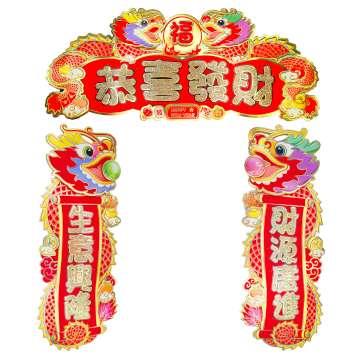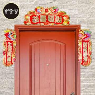 摩達客◉春節開運招財◉雙龍戲珠恭喜發財生意興隆財源廣進門聯三片組-橫批+左右對聯春聯