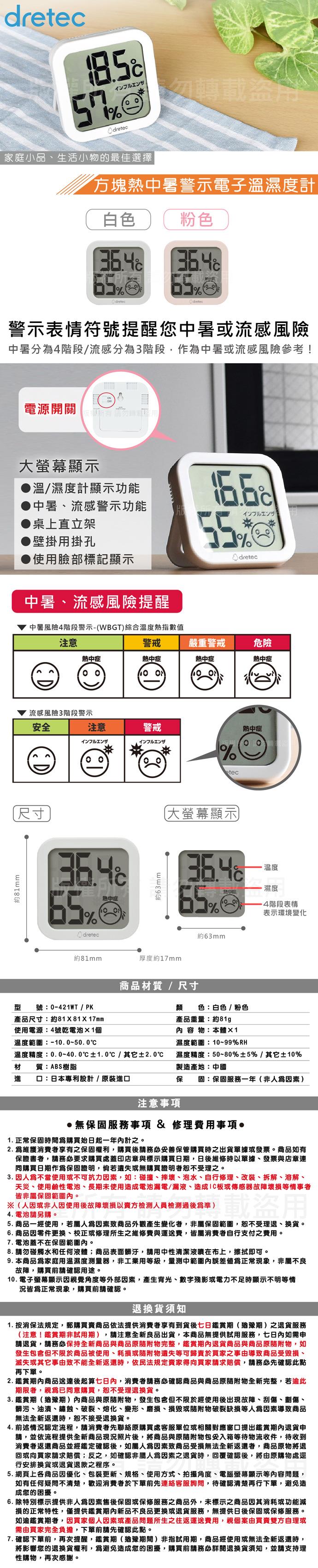 【日本dretec】方塊熱中暑警示電子溫溼度計-表情顯示-粉色 (O-421PK)