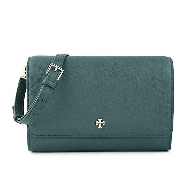 TORY BURCH 雙T-LOGO防刮皮革翻蓋斜背包-深綠