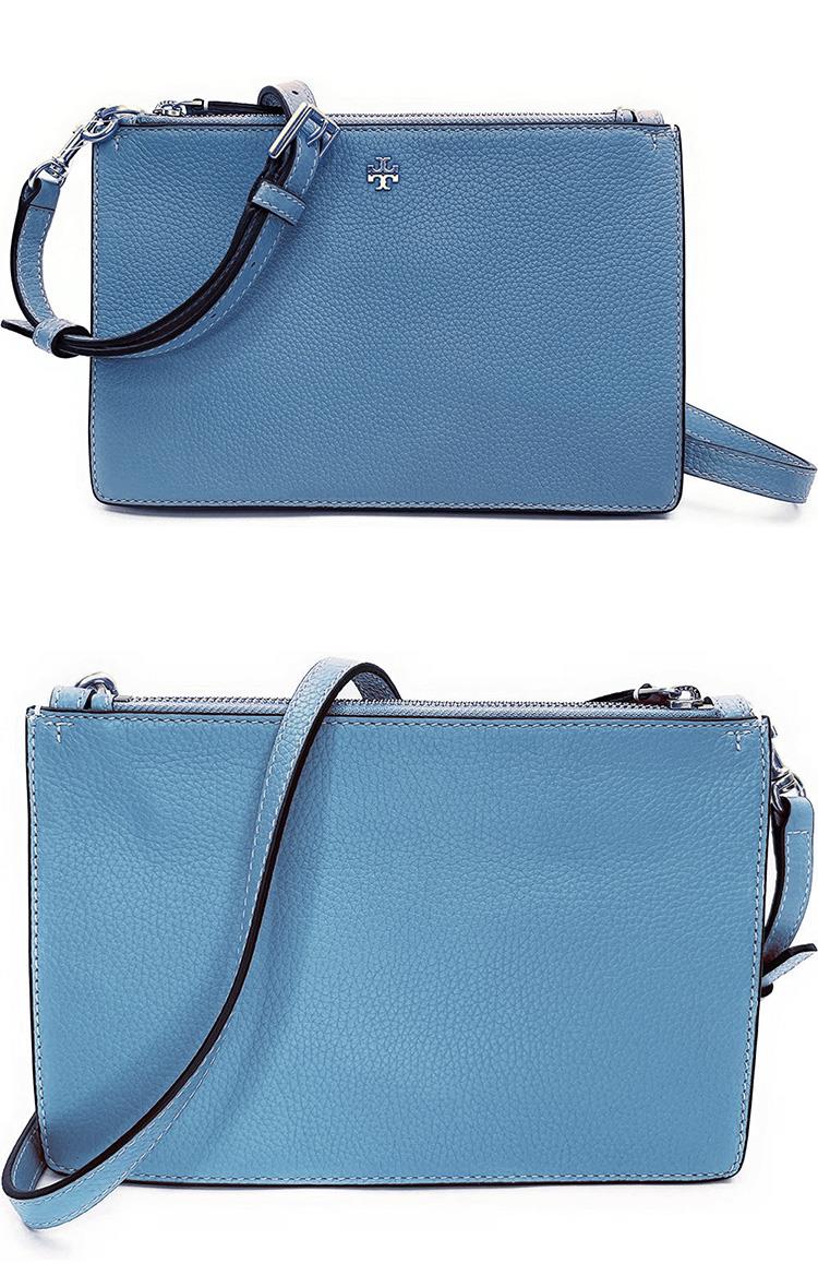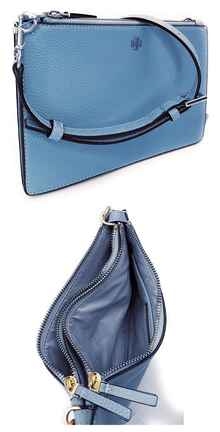 TORY BURCH 皮革雙層拉鍊斜背包-水藍