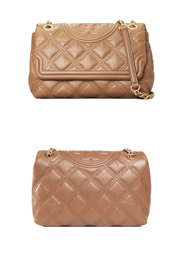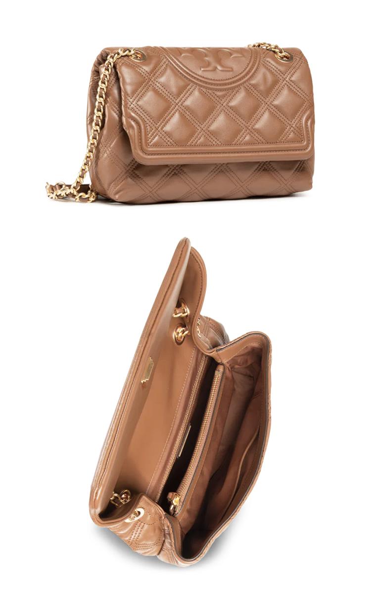 TORY BURCH 菱格紋皮革翻蓋斜背包-駝