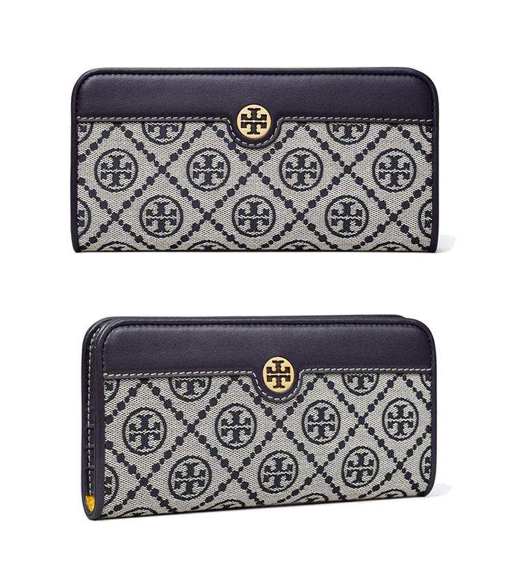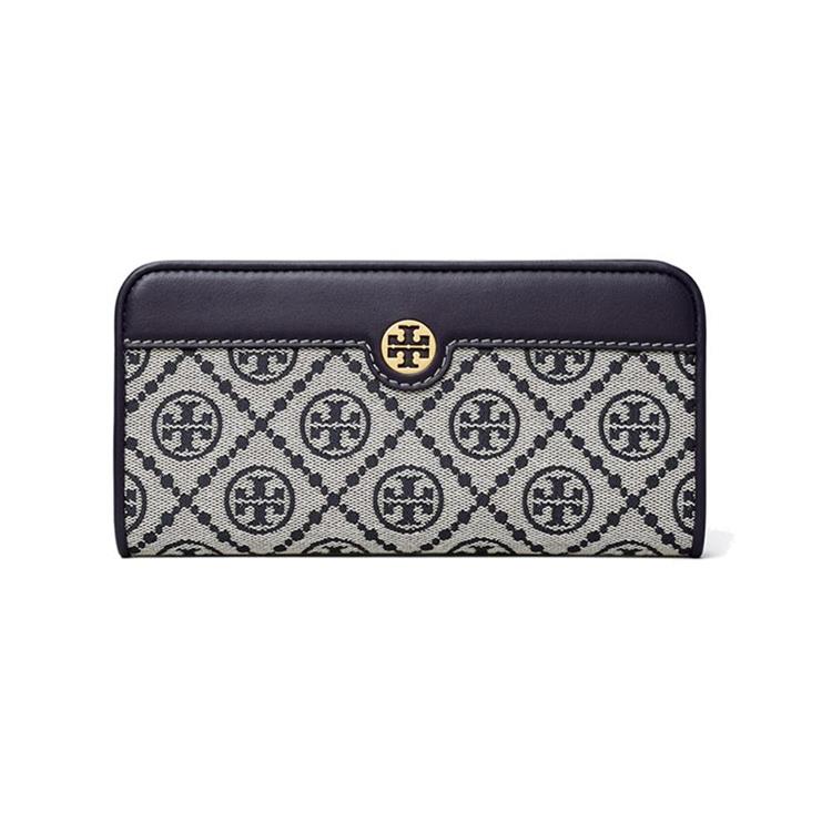 TORY BURCH 雙T-LOGO提花拼接皮革拉鍊長夾-深藍