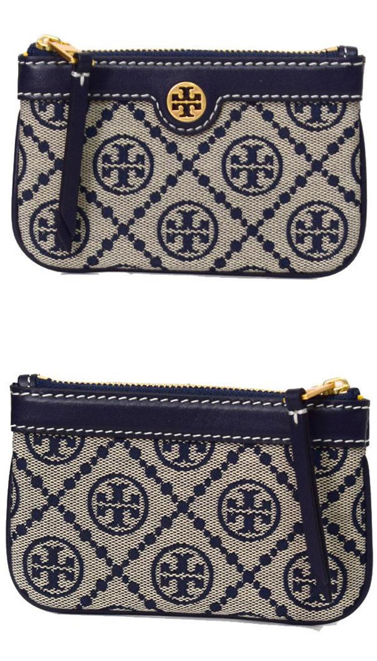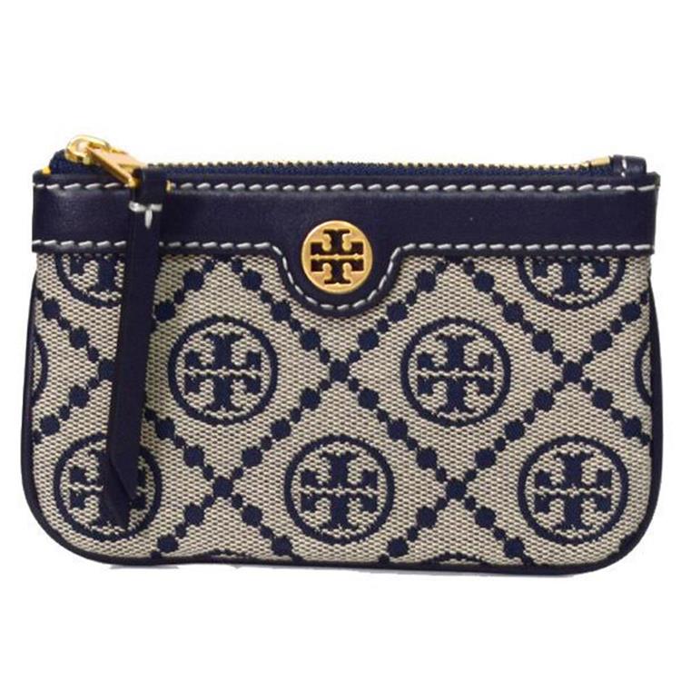 TORY BURCH 雙T-LOGO提花拼接皮革零錢包-藍色