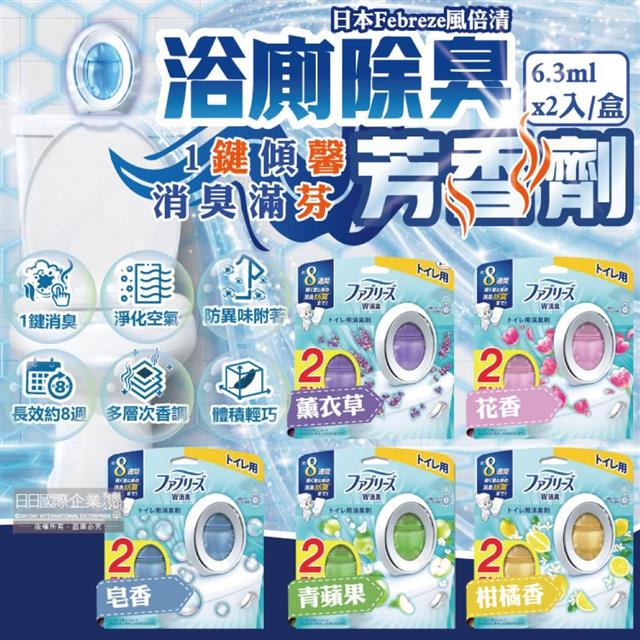 日本Febreze風倍清-淨味持香約8週浴室廁所W消臭芳香劑6.3mlx2入/盒(按鈕型1鍵除臭/如廁淨化空氣防臭香氛盒/衛浴去味自動擴香)