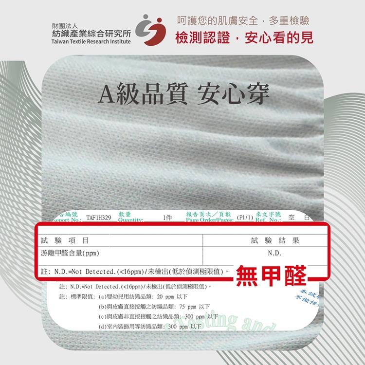 舒適透氣 拒絕緊貼悶汗 TTRI檢測,不含甲醛、偶氮 全程台灣製造