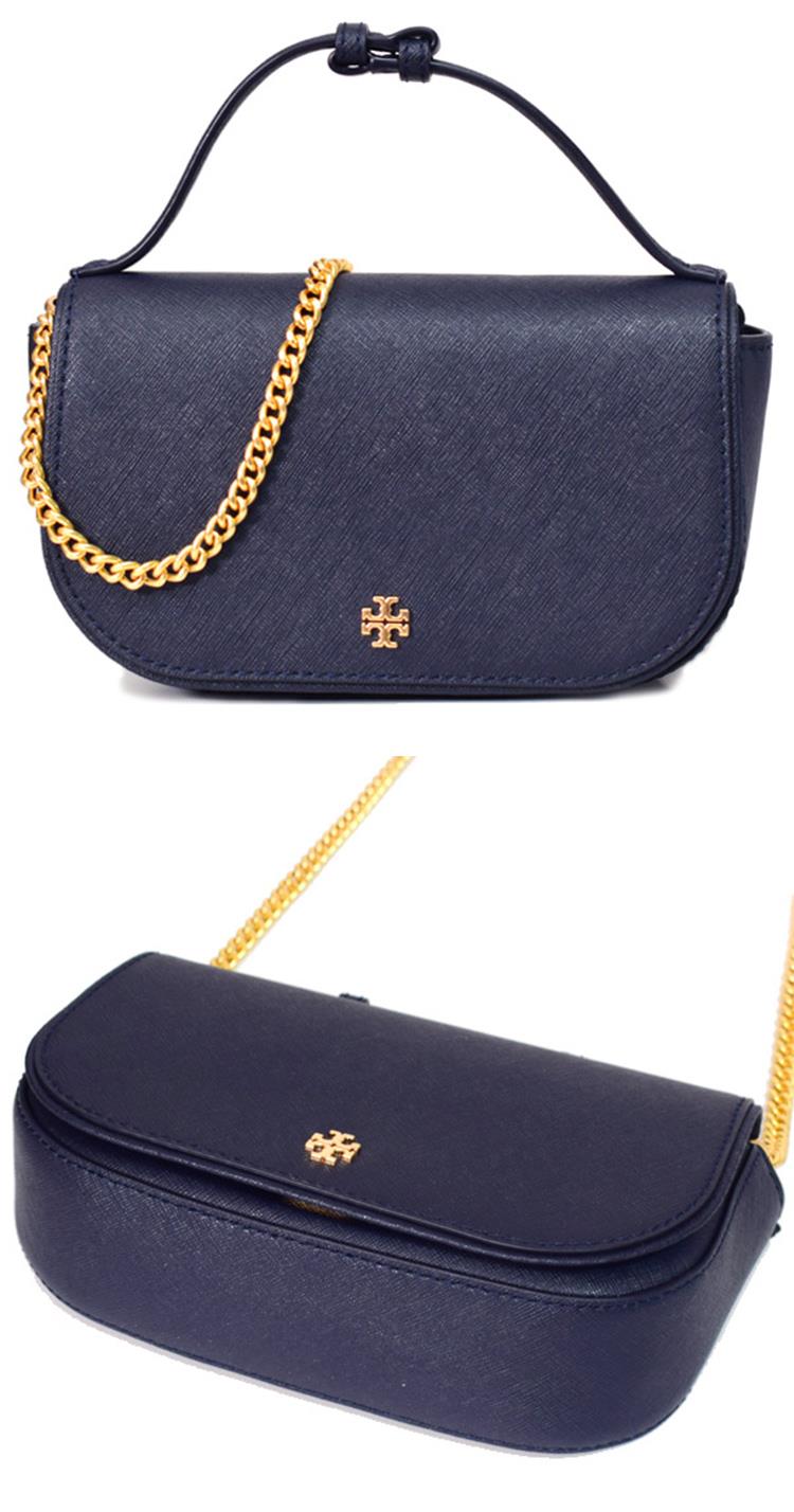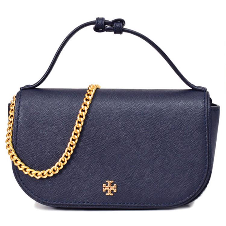Tory burch 雙T-LOGO防刮皮革斜背鍊包-深藍