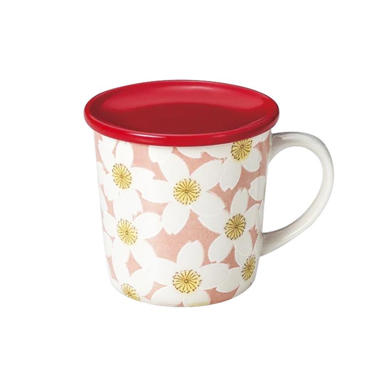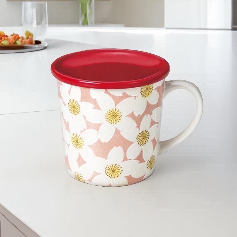 由簡單的白瓷製成的馬克杯,大膽的大面櫻花圖案搭配紅色蓋子,在日常使用中粉粉的很美好!