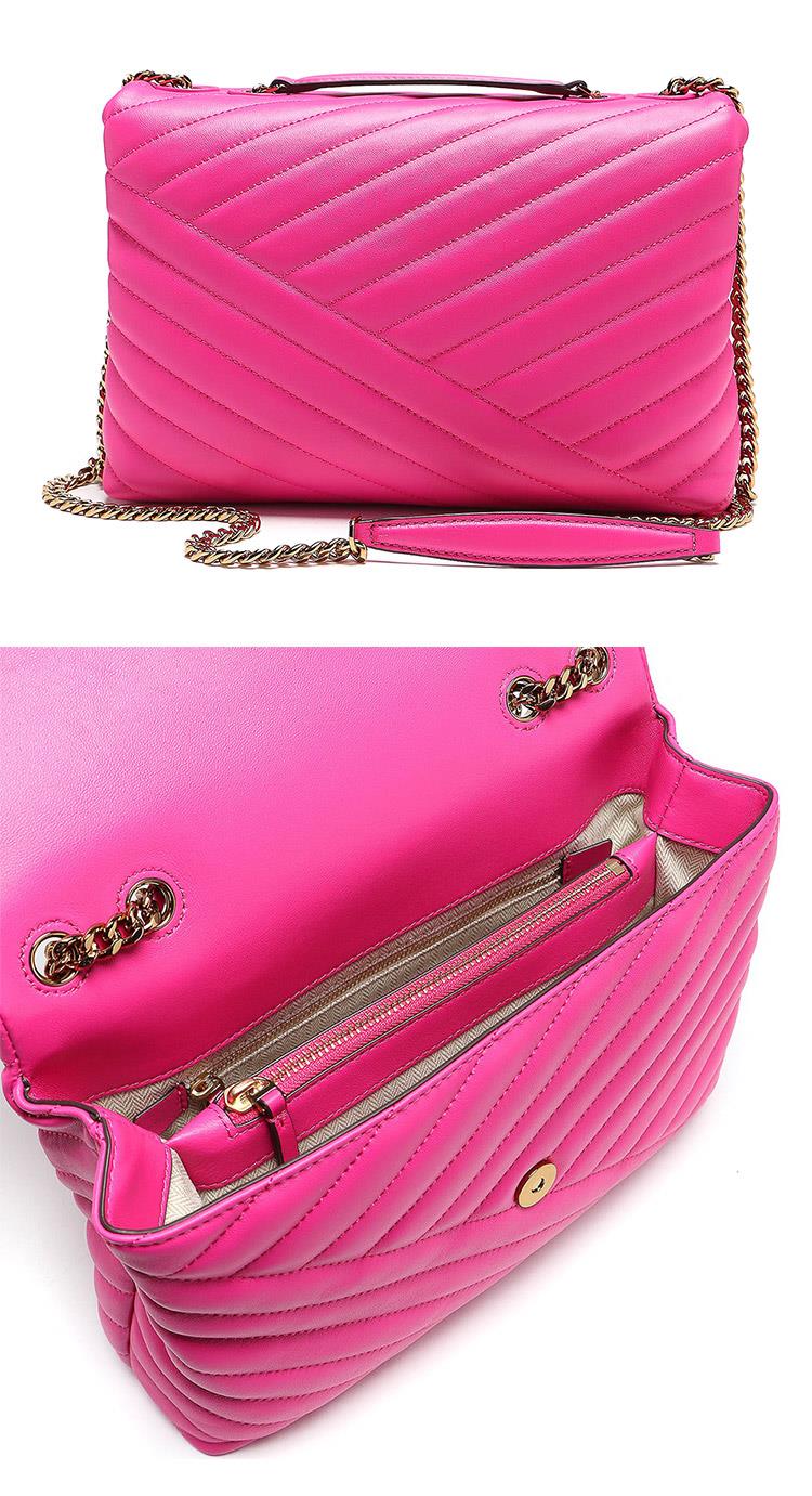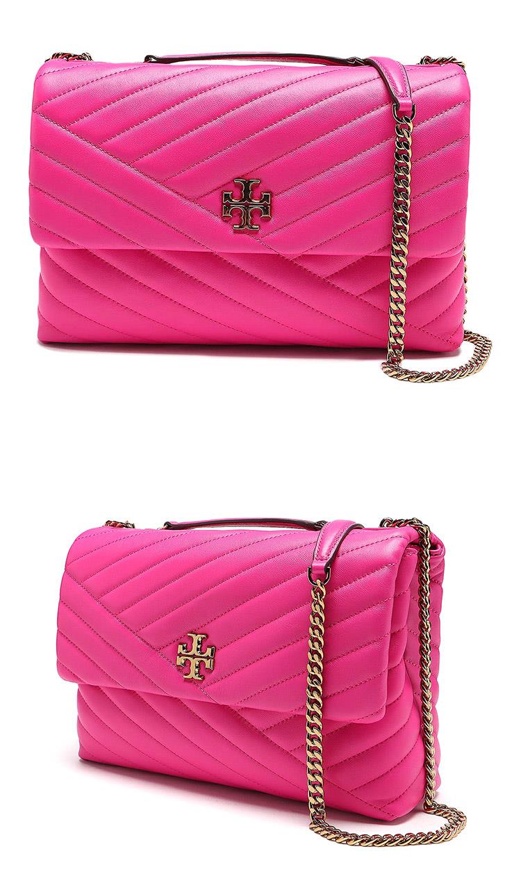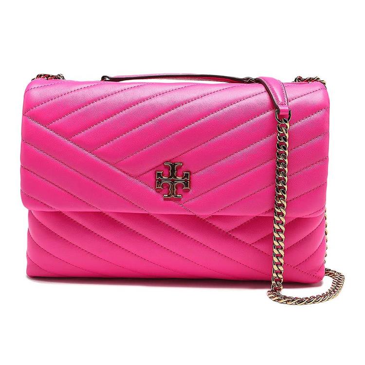 TORY BURCH 斜紋衍縫翻蓋斜背包-桃紅
