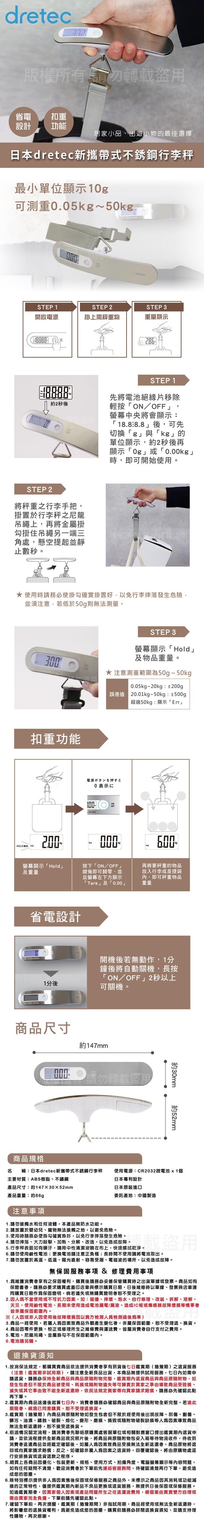 【日本dretec】日本新攜帶式行李秤-50kg-不銹鋼(LS-105WT)