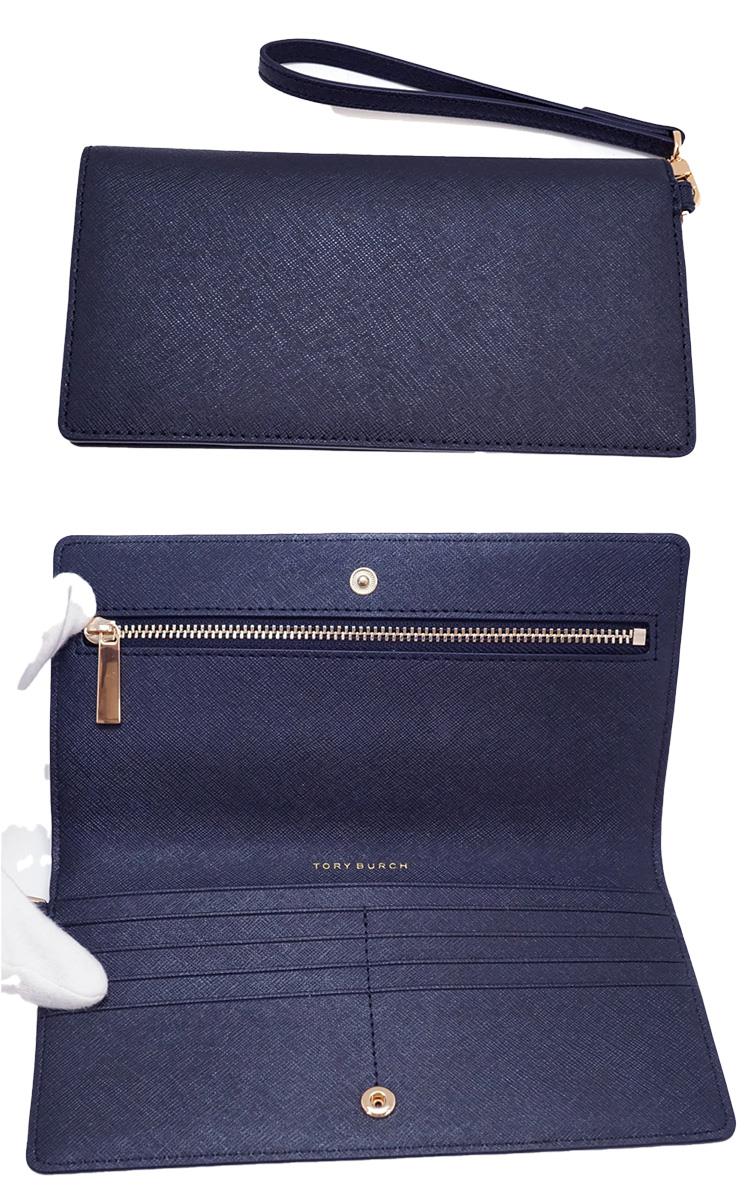 Tory burch 雙T-LOGO防刮皮革對開長夾-深藍