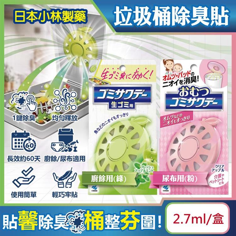 日本Kobayashi小林製藥-淨味芳香長效約60天垃圾桶專用蘋果造型除臭貼2.7ml/盒(廚餘去味清香貼/淨化空氣防異味香氛盒/尿布去味消臭擴香劑)