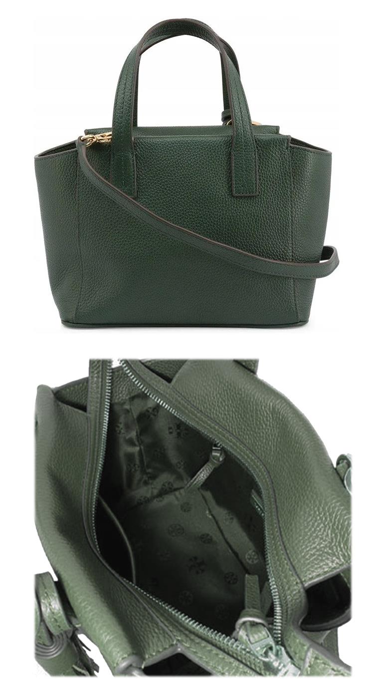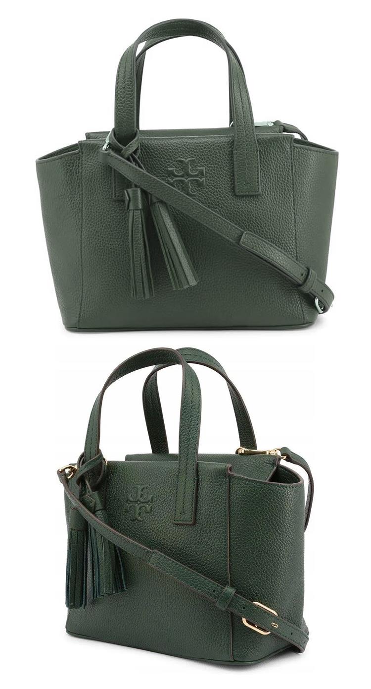 TORY BURCH 素面皮革流蘇斜背手提包-深綠