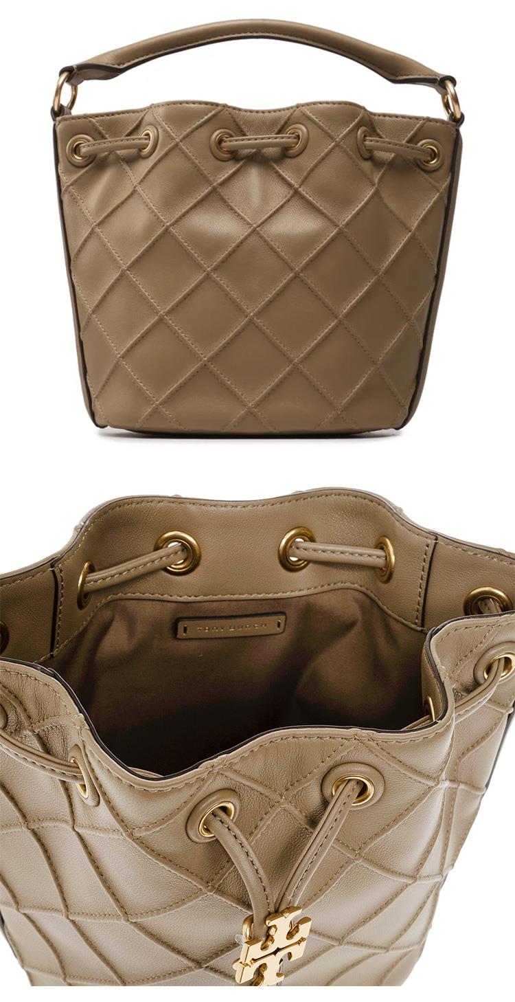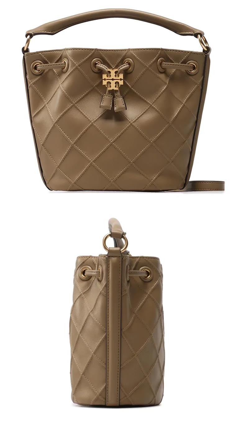 TORY BURCH 格菱紋縫線皮革水桶包-卡其