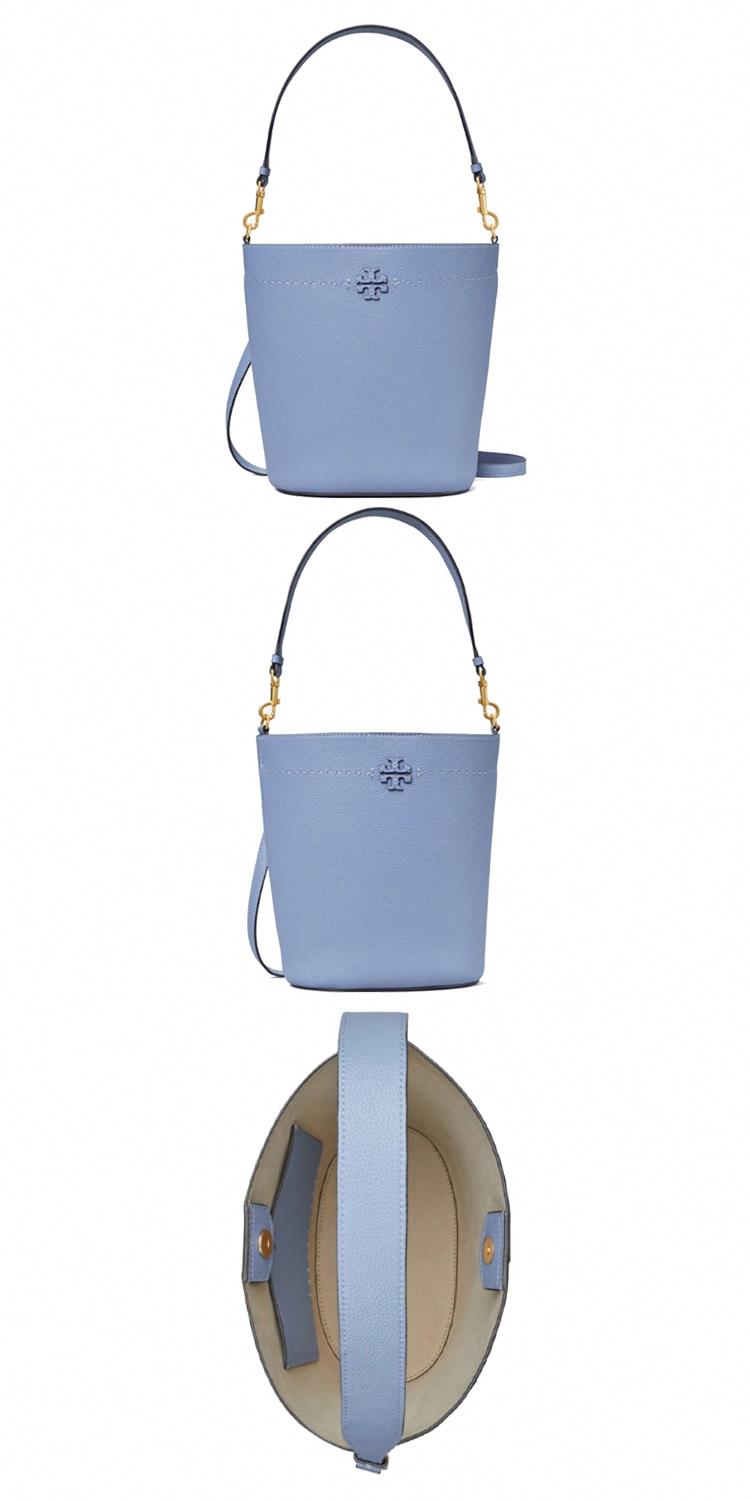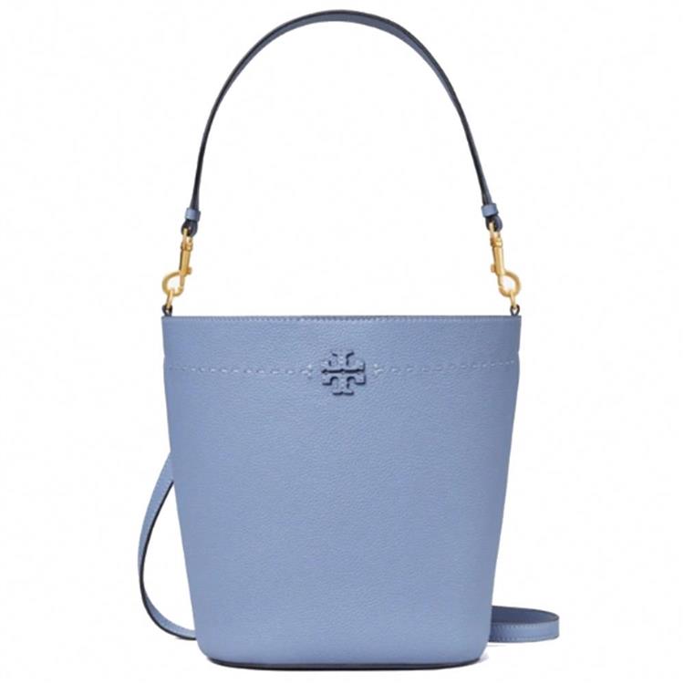Tory burch 雙T-LOGO素面皮革水桶包-天空藍