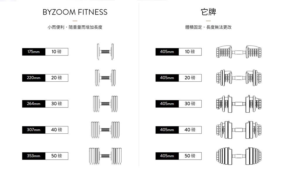 - 啞鈴長度隨重量作改變,不受固定長度牽絆