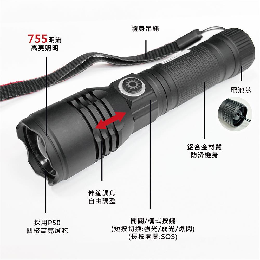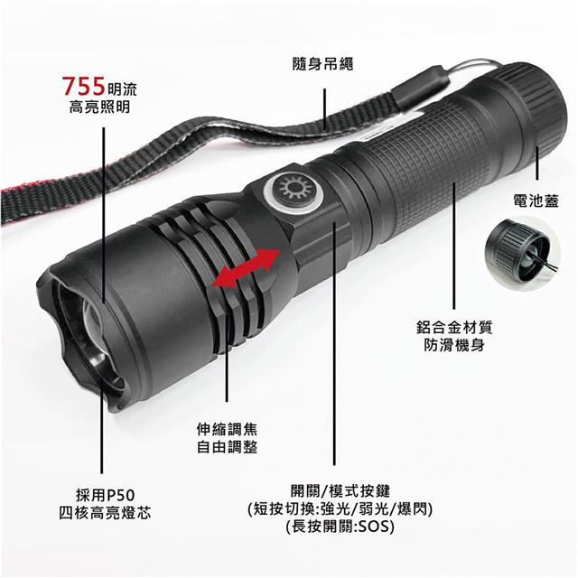 採用P50四核高亮燈芯,755流明超強光、省電、壽命長