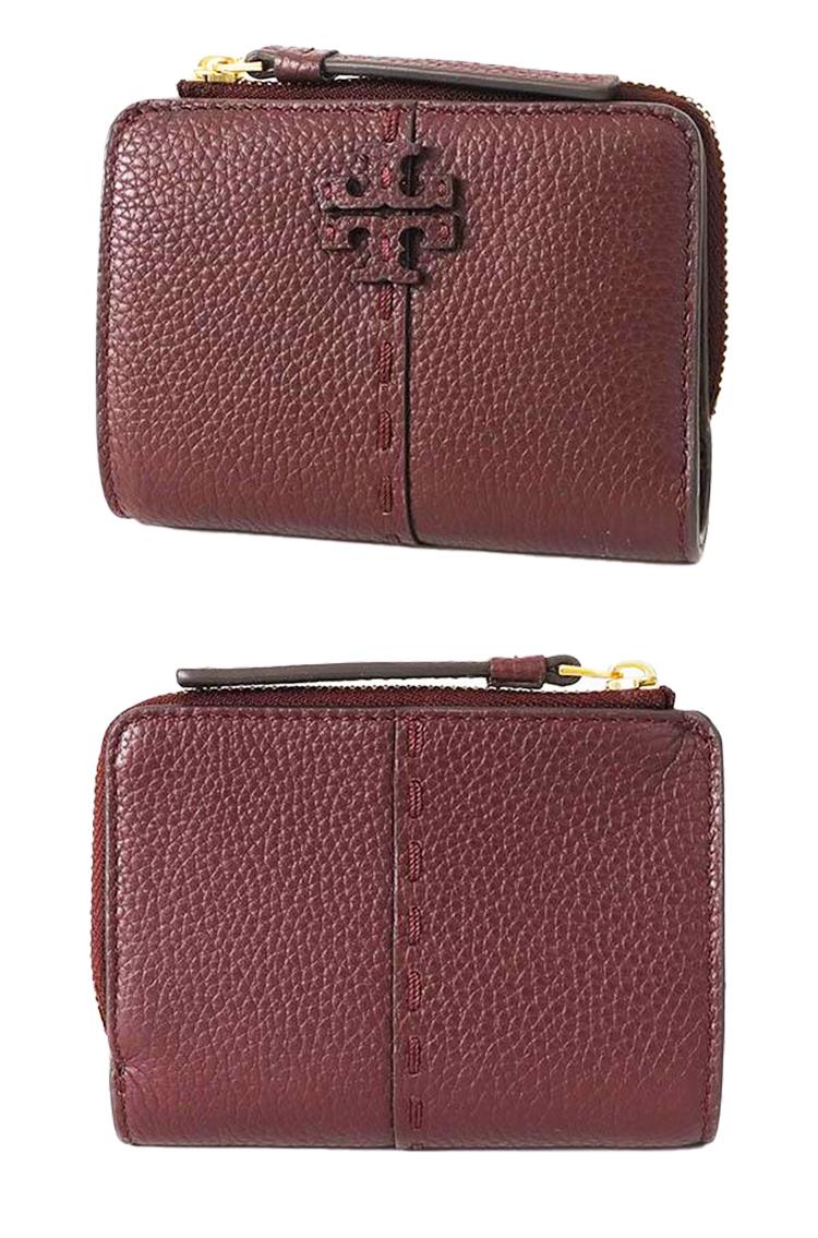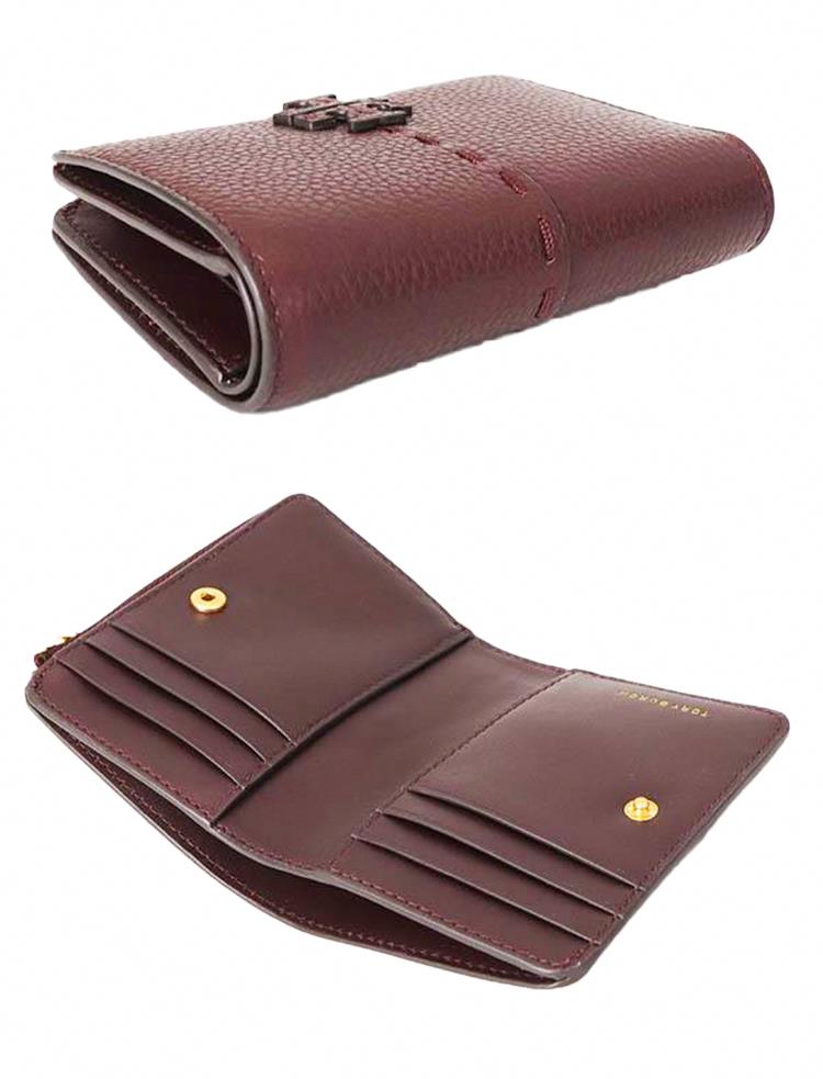Tory Burch 縫線皮革對開二折短夾-酒紅