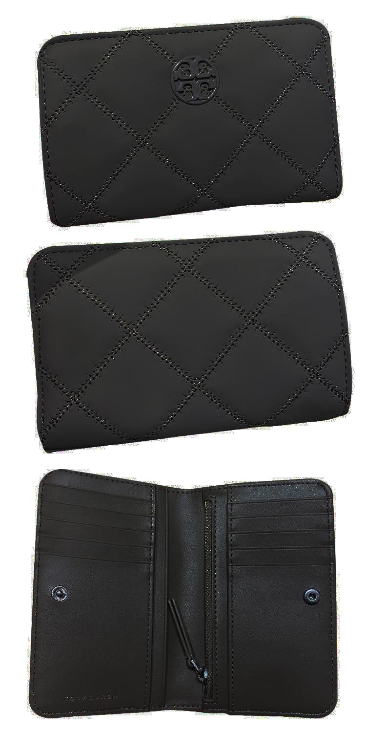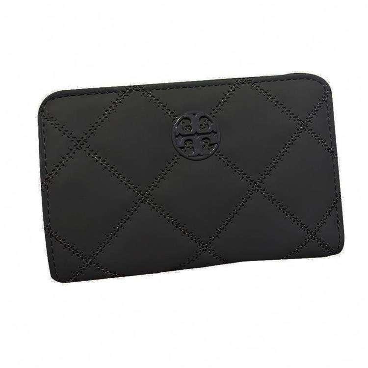 Tory burch 菱格紋皮革中夾-磨砂黑