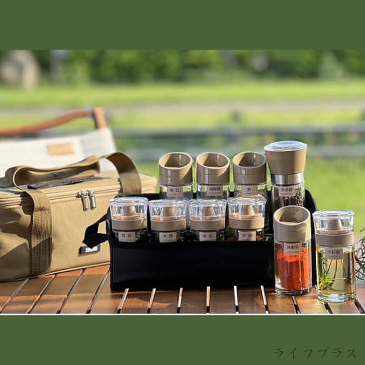 多用途使用設計,玻璃材質罐身易辨識內容物,適合裝盛各式調味品,可放各式調味料,分格內盒瓶身放置有序,前後排高低差方便取拿,一袋搞定,附收納提袋、抹布、調罐貼紙方便辨識,居家、露營、旅行使用攜帶方便。