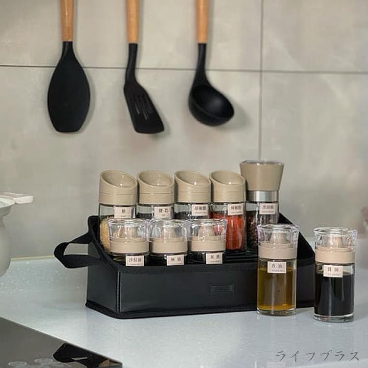 多用途使用設計,玻璃材質罐身易辨識內容物,適合裝盛各式調味品,可放各式調味料,分格內盒瓶身放置有序,前後排高低差方便取拿,一袋搞定,附收納提袋、抹布、調罐貼紙方便辨識,居家、露營、旅行使用攜帶方便。