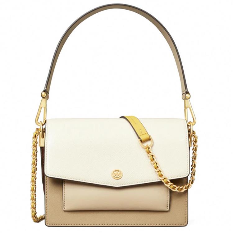 TORY BURCH 拼接皮革翻蓋斜背鍊包-米白