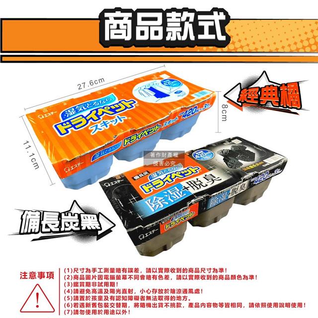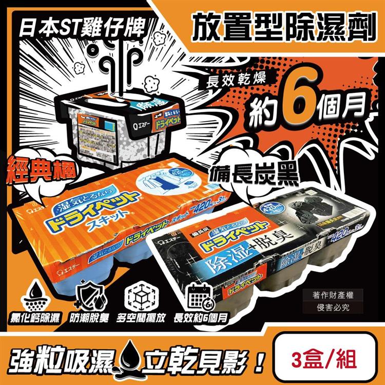 日本ST雞仔牌-防潮脫臭家庭用收納櫃放置型除濕劑3盒/組(吸濕量420ml/靜置式集水盒/備長炭吸臭顆粒/活性炭乾燥劑/大容量衣鞋櫃壁櫥空間去味)