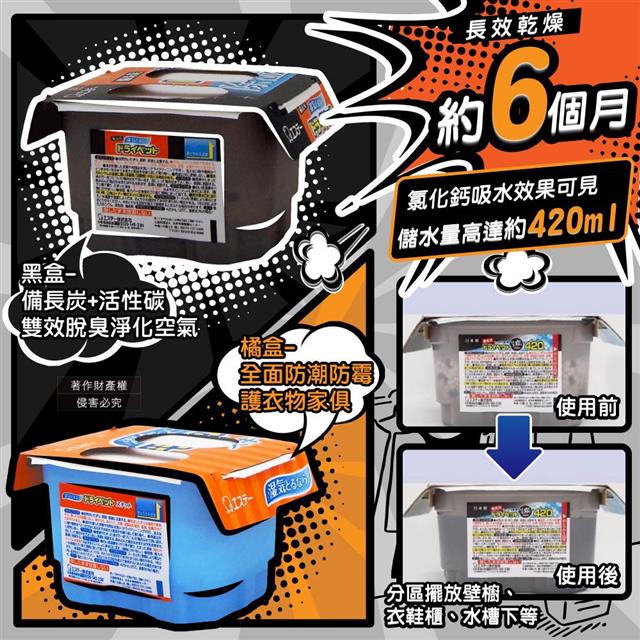 ●日本製,氯化鈣吸水效果可見,儲水量高達420ml,長效乾燥約6個月!