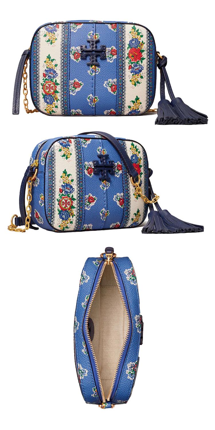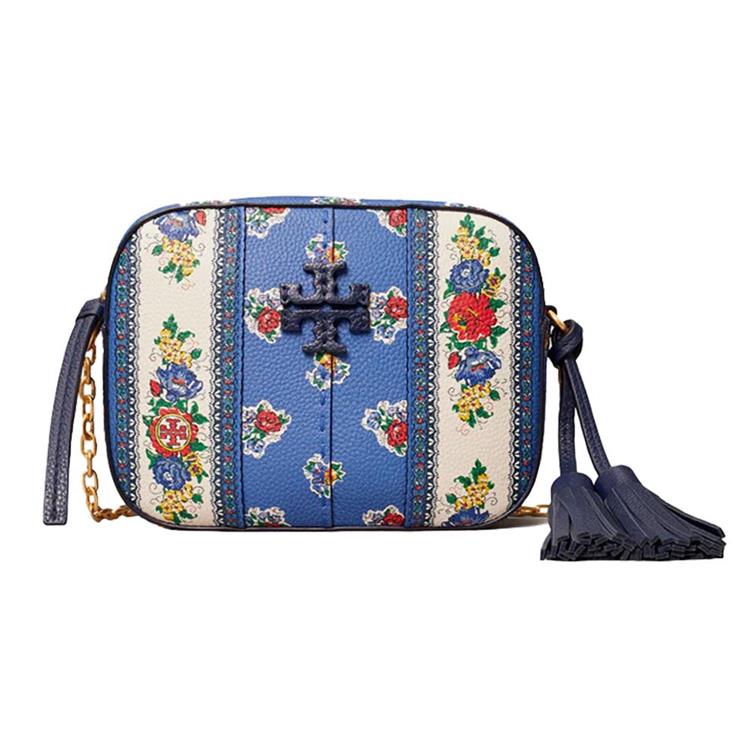 Tory burch 花卉皮革斜背鍊包-藍
