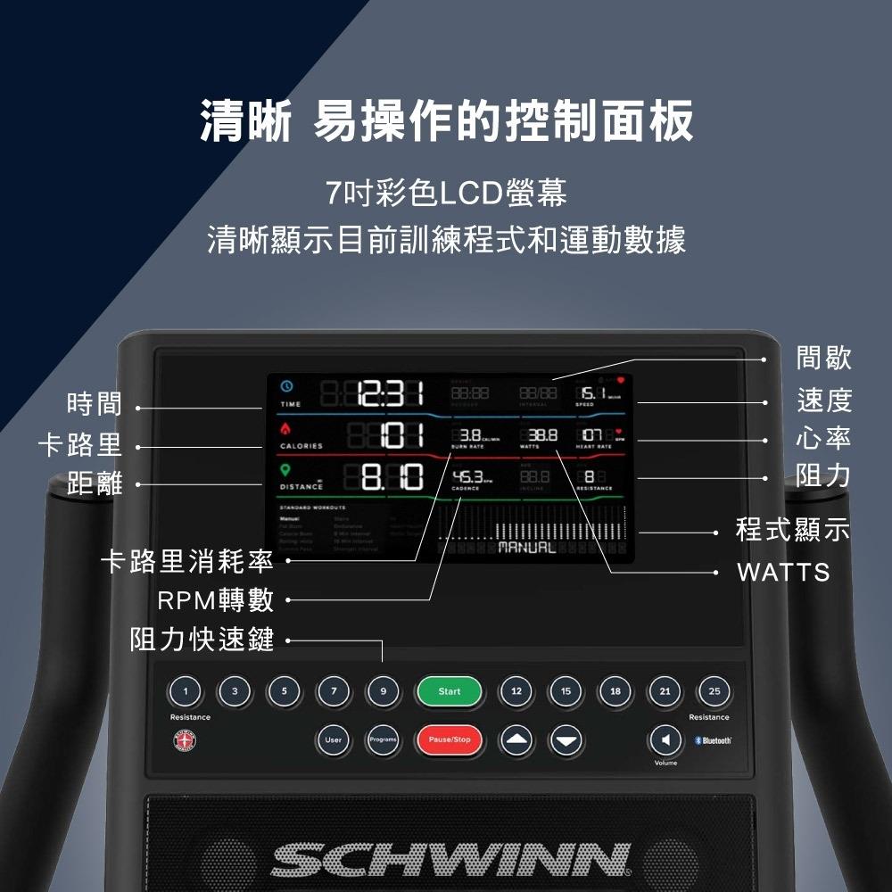 顯示資訊 時間、間歇數據、速度、卡路里、卡路里消耗率、WATTS、心率、距離、RPM轉數、阻力、程式顯示