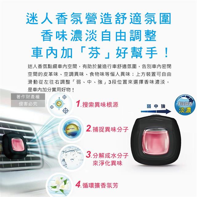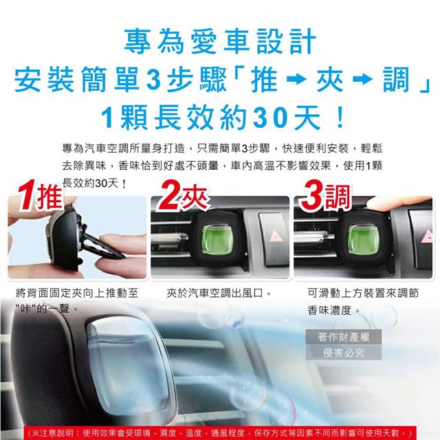 ●專為愛車設計,安裝簡單,自由調整香味濃淡,使用1顆長效約30天!