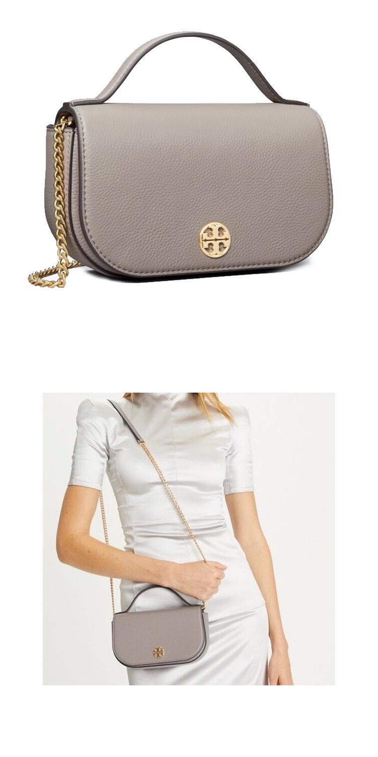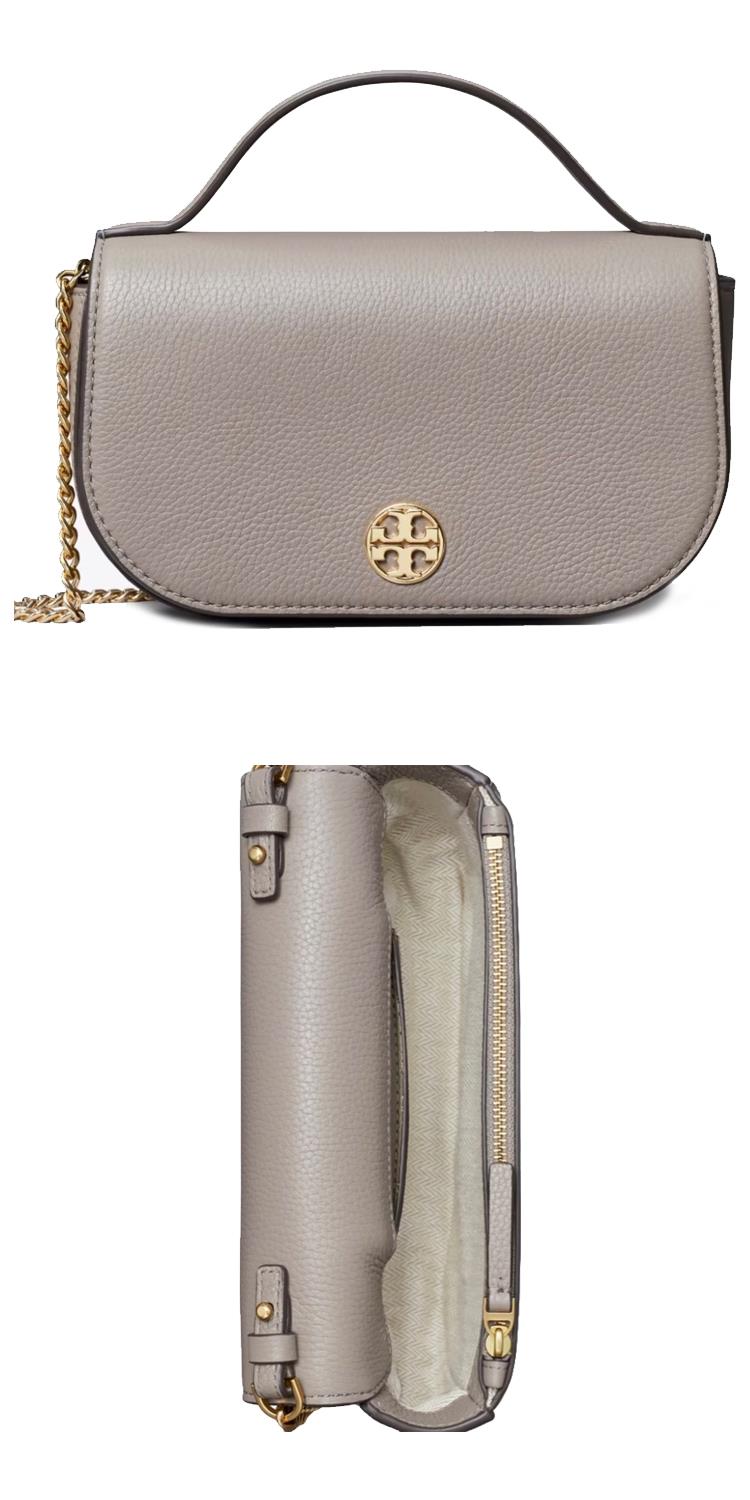 TORY BURCH 荔枝皮革翻蓋手提/斜背包-奶茶灰
