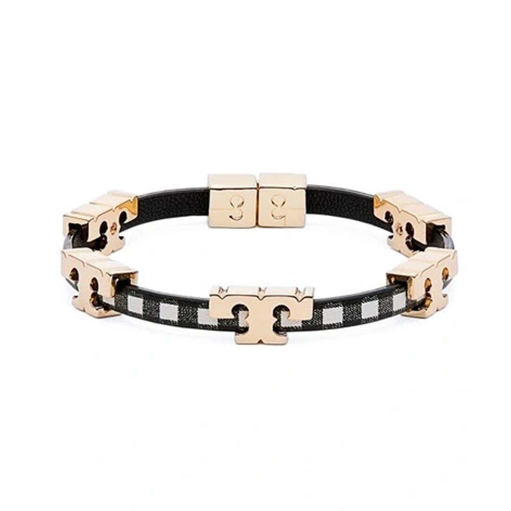 TORY BURCH 黑白格皮革T字金屬LOGO手環