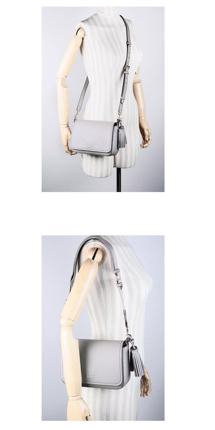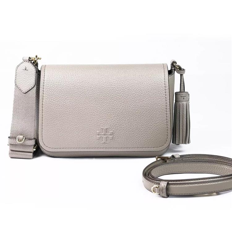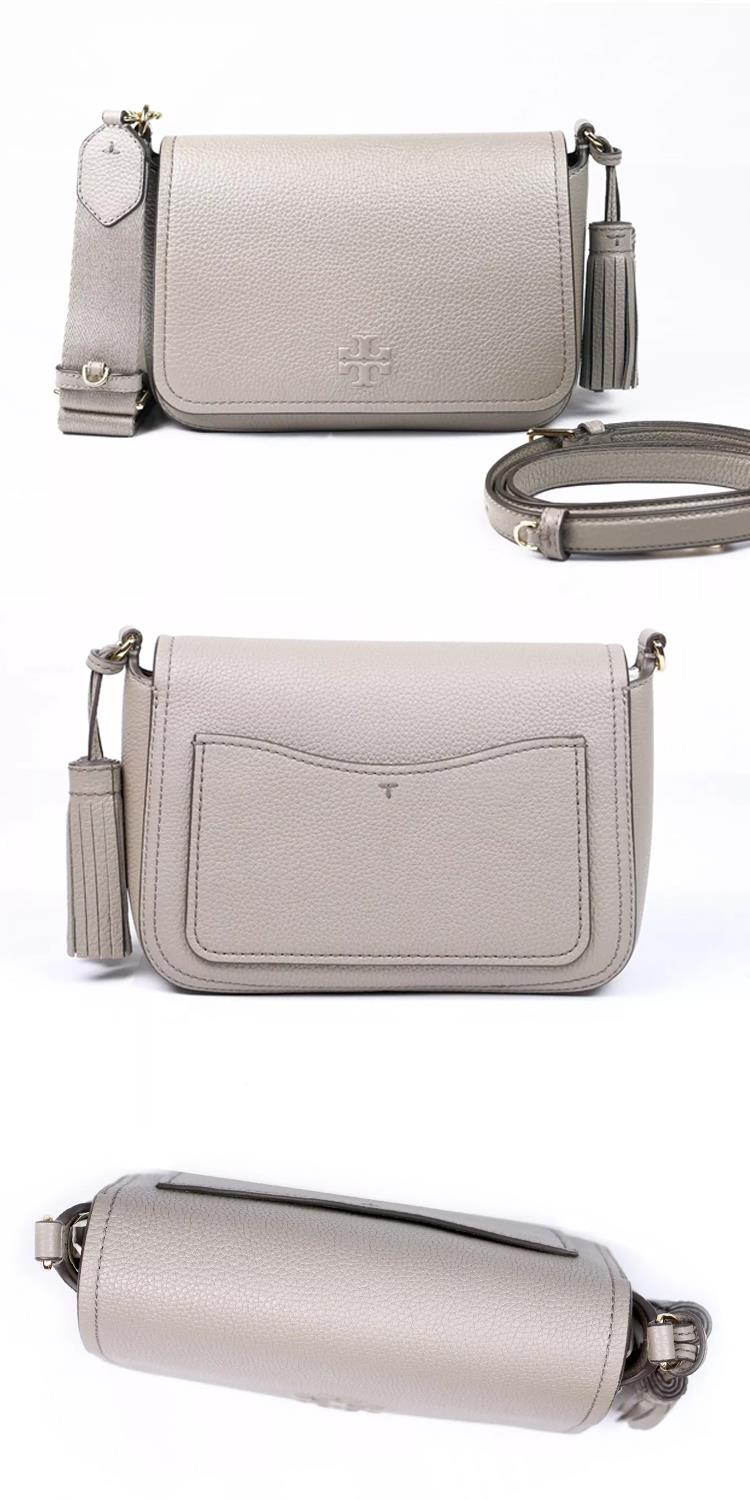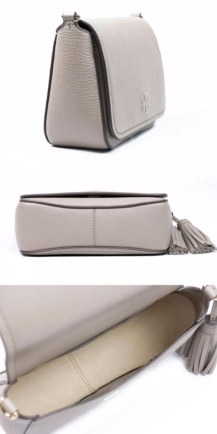 TORY BURCH 荔枝皮革翻蓋流蘇斜背包-灰(背帶兩款可替換)