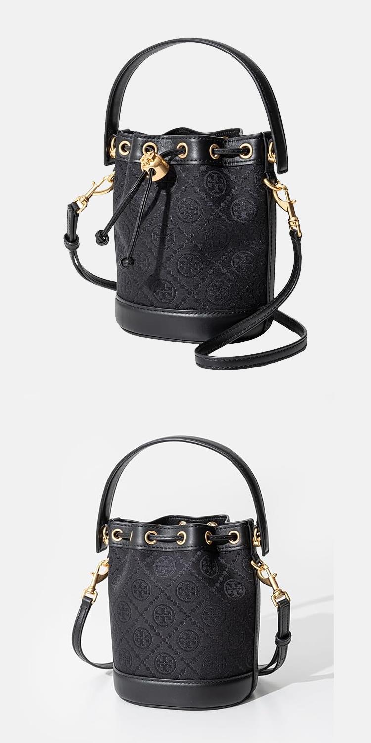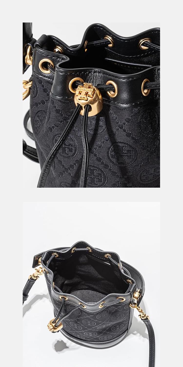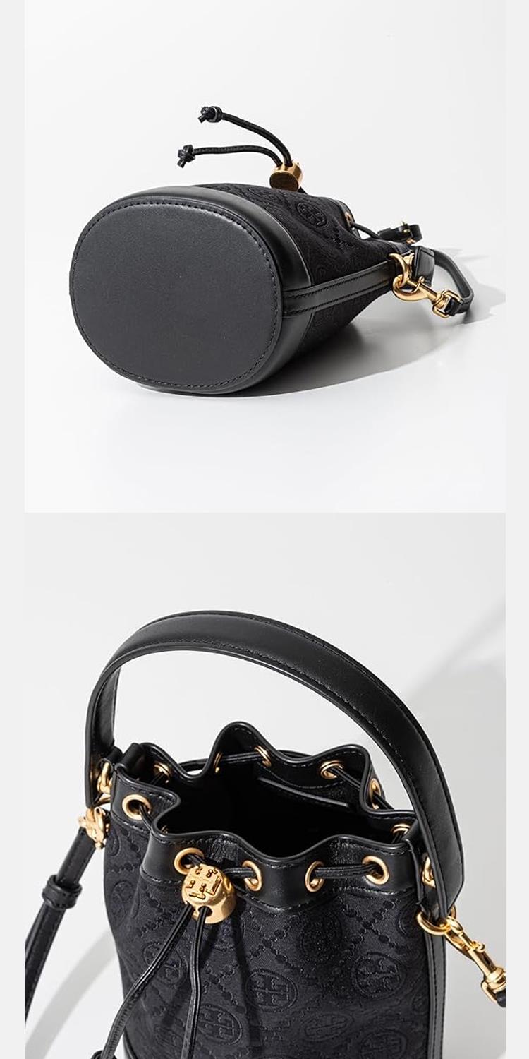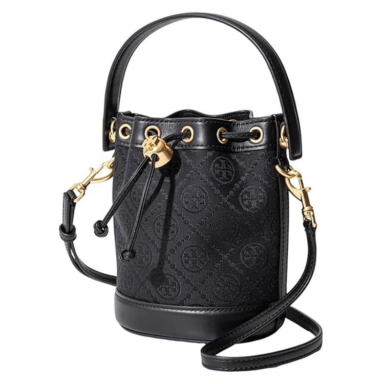 TORY BURCH 緹花織布拼接皮革束口水桶包-黑