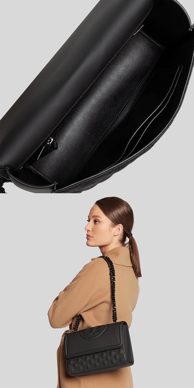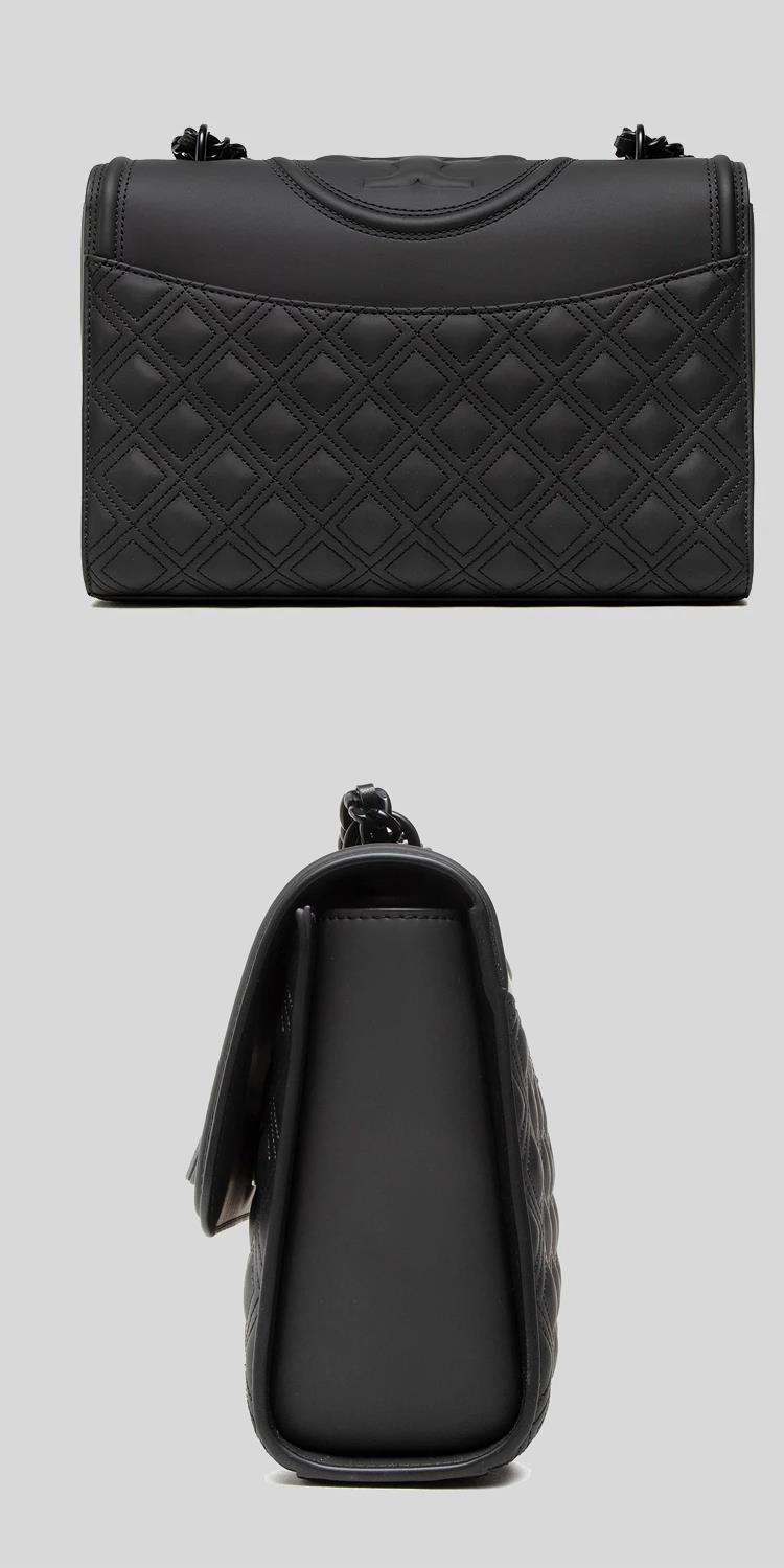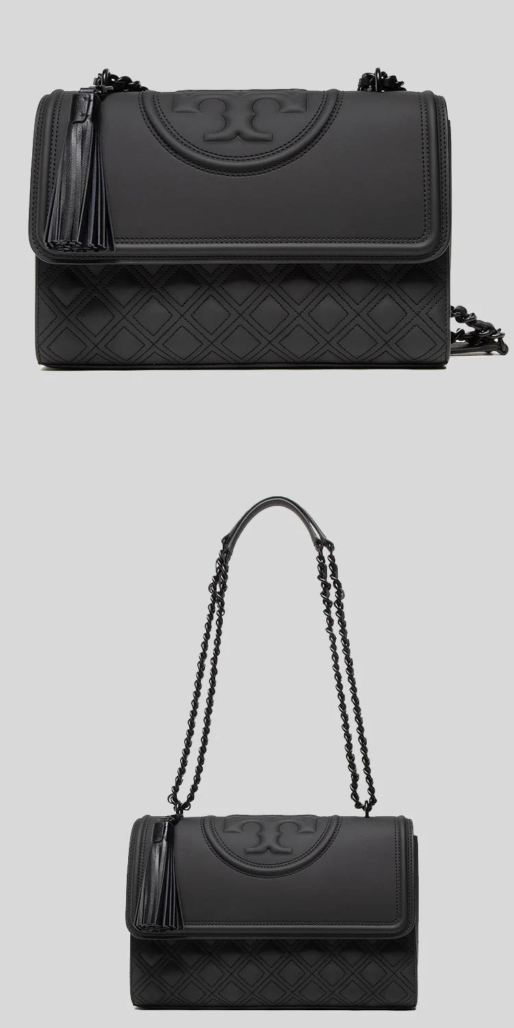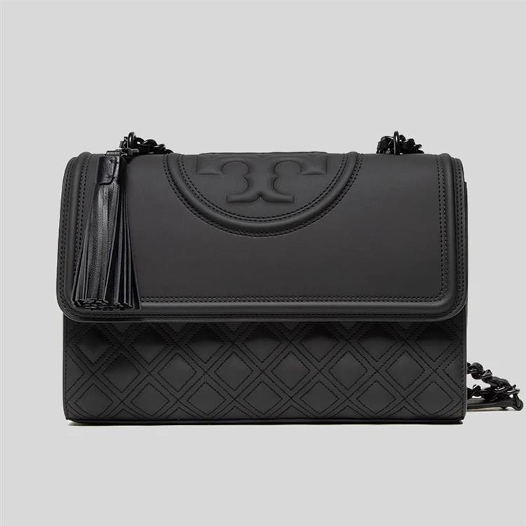 TORY BURCH 霧面菱格紋翻蓋流蘇肩背包-黑