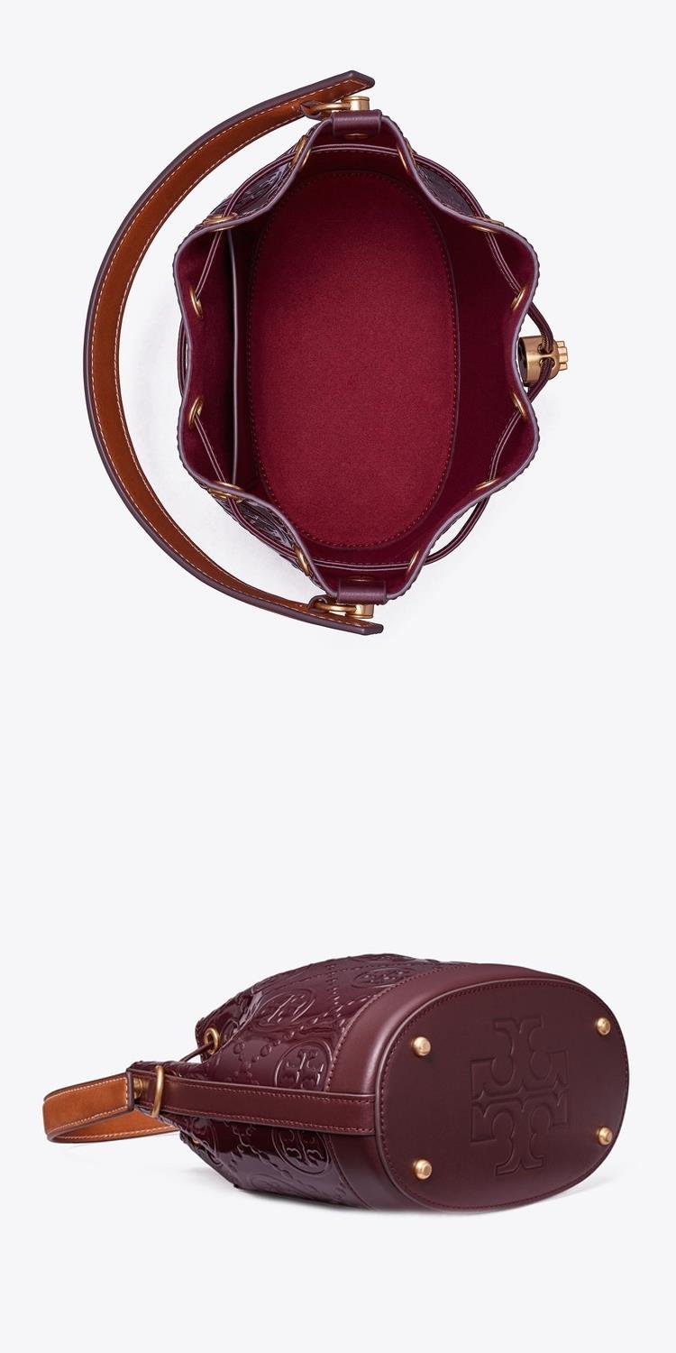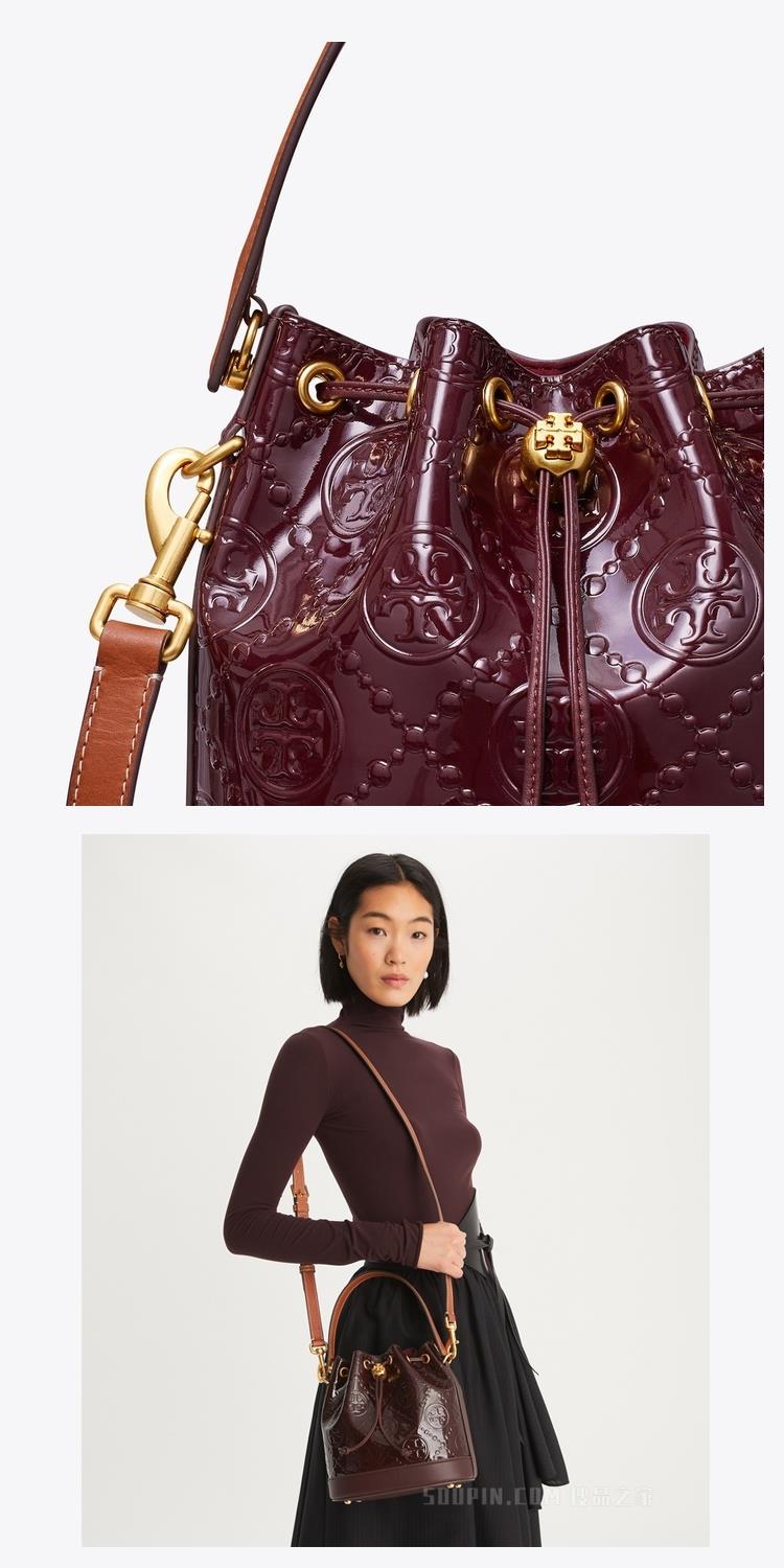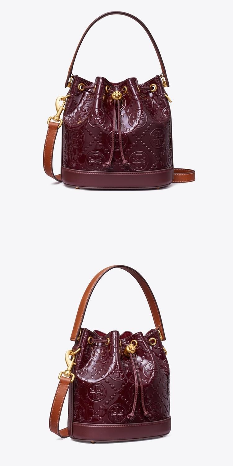 TORY BURCH 漆皮浮雕LOGO素色束口水桶包/兩用包-酒紅