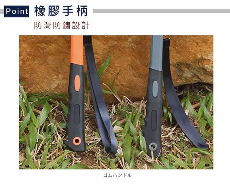 手帶預防意外脫手,輕鬆敲擊即可產生極大力道,特殊彎頭協助拔營時較省力