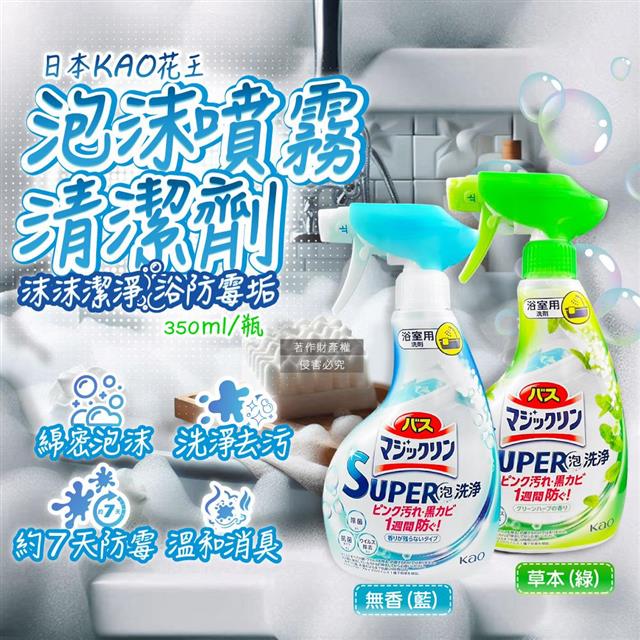 日本KAO花王-SUPER泡洗淨浴室除垢防霉消臭泡沫噴霧清潔劑350ml/瓶(Magiclean/衛浴磁磚粉紅漬清洗/洗手台排水口除黏液/浴缸去皂垢中性洗劑)